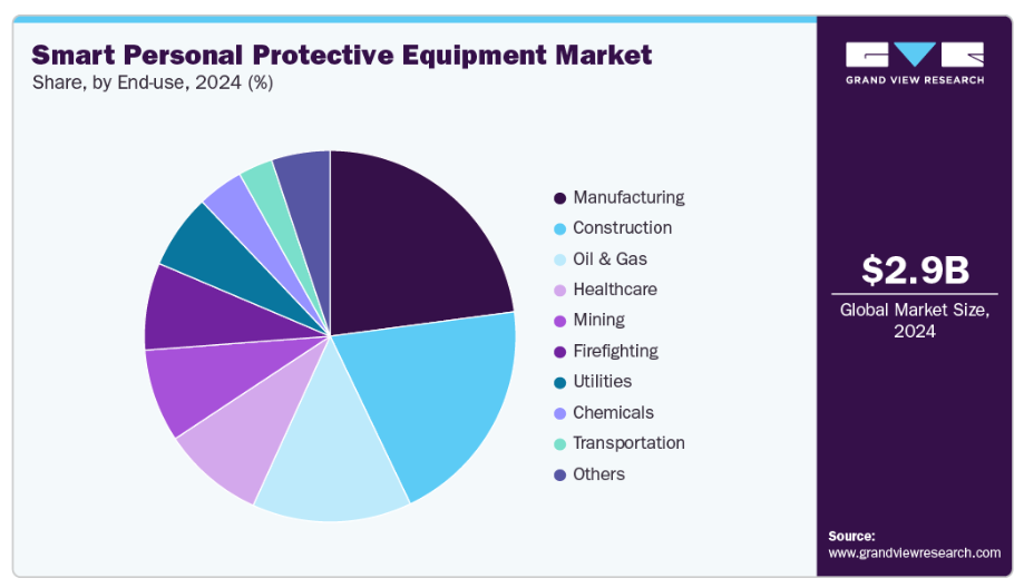 製造業セクターは、職場での負傷リスクの高さと厳格な安全規制により、2024年に市場を支配し、収益シェアの22.9%を占めました。手袋、ヘルメット、ベストなどのスマートPPEは、作業員の安全をリアルタイムで監視するのに役立ちます。IoTとセンサー技術の統合は、業務効率を向上させ、事故を減少させます。先進的な安全ソリューションの継続的な採用が、製造業の市場における主導的立場を強化しています。