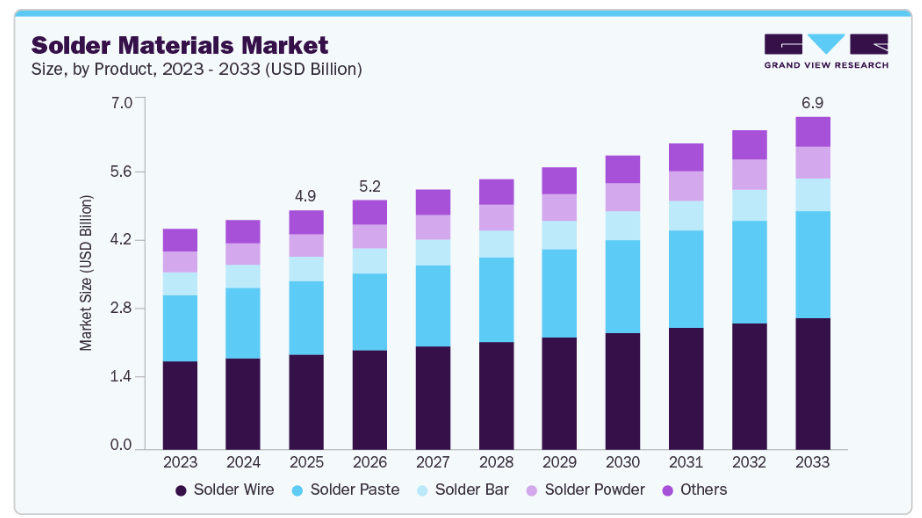 スマートフォン、ウェアラブルデバイス、スマートホームデバイスの普及が進んでいることで、プリント基板(PCB)の出荷量が大幅に増加し、それによりはんだの消費が促進されています。電気自動車および先進運転支援システム(ADAS)の普及は、これらのシステムに信頼性が高く高性能なはんだ付けソリューションが求められることから、需要をさらに拡大させています。さらに、電子部品の小型化により、高精度なはんだ材料へのニーズが高まっています。データセンターや5Gインフラの拡張も、需要の着実な成長を支えています。医療用電子機器や産業用オートメーションの用途も、新たな需要の牽引役として台頭しています。