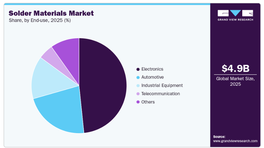 2025年には、民生用電子機器、産業用電子機器、通信機器の製造においてはんだ材料が広く使用されていることから、電子セグメントが市場を牽引し、売上高シェアの48.3%を占めました。スマートフォン、ノートパソコン、ウェアラブル機器、ネットワーク機器の大量生産により、はんだ材料に対する強い需要が引き続き生み出されています。さらに、電子アセンブリの複雑化や部品密度の向上に伴い、信頼性の高いはんだ付けソリューションが求められており、市場全体の売上高において電子機器用途セグメントの優位性を強めています。