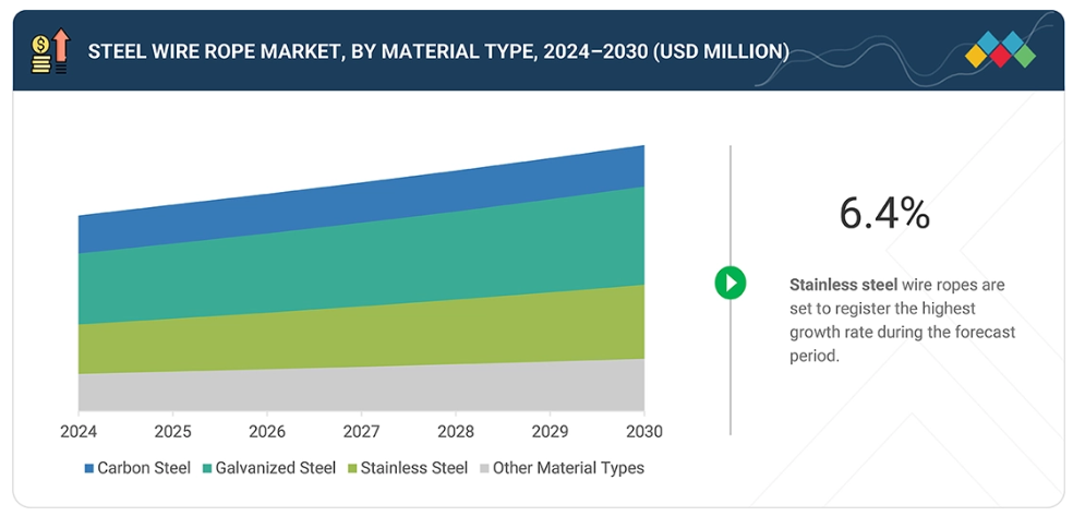 鋼製ワイヤーロープ市場は、材質の種類に基づき、炭素鋼、亜鉛メッキ鋼、ステンレス鋼、その他の材質の種類に分類されます。2024年には炭素鋼が最大の市場シェアを占めましたが、予測期間中はステンレス鋼セグメントが最も高いCAGR(年平均成長率)を記録すると見込まれています。