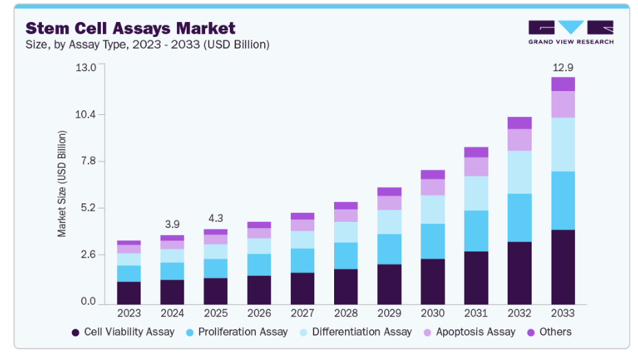 さらに、幹細胞、特にiPS細胞や成体幹細胞を用いた臨床試験の増加に伴い、細胞の生存率、分化能、分化ポテンシャルを評価するための信頼性が高く標準化されたアッセイの必要性が高まっています。研究プロジェクトがより複雑化し、トランスレーショナルリサーチ(臨床応用研究)が進むにつれ、研究所では再現性と精度を確保するため、包括的なアッセイプラットフォームや自動化システムを導入しており、これが先進的な幹細胞アッセイソリューションの需要を後押ししています。