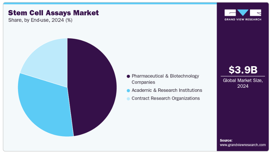 2024年時点で、製薬・バイオテクノロジー企業セグメントは47.95%という最大の収益シェアを占め、幹細胞アッセイ産業をリードしました。幹細胞アッセイ市場における製薬・バイオテクノロジー企業は、創薬プロセスの加速と失敗率低減のため、信頼性が高くヒト関連性の高いモデルの需要が高まっています。これらの企業は、疾患関連細胞タイプにおける薬剤の有効性、毒性、作用機序を評価するため、幹細胞由来アッセイ、特にiPS細胞およびオルガノイドベースのシステムへの依存度をますます高めています。患者特異的モデルを生成する能力は精密医薬品(医薬品)の取り組みを支援すると同時に、ハイスループットかつ自動化されたワークフローの推進は、大規模な化合物ライブラリ全体での試験のスケールアップを可能にします。これらの要因が相まって、幹細胞アッセイは研究開発の効率化と成功率向上を目指す製薬・バイオテクノロジー企業にとって不可欠なツールとなっています。