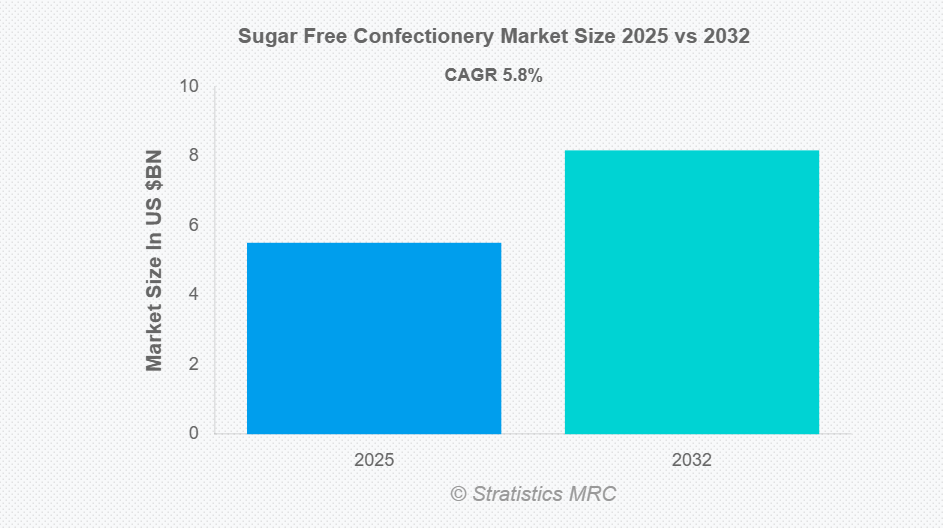 Stratistics MRCによると、世界の無糖菓子市場は2025年に55億1000万ドル規模となり、予測期間中に年平均成長率(CAGR)5.8%で成長し、2032年までに81億7000万ドルに達すると見込まれています。