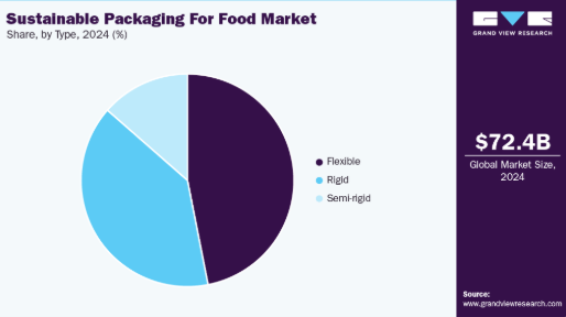 紙セグメントは2024年に38.0%超の最大の市場収益シェアを記録し、予測期間中は8.8%という最速のCAGRで成長すると見込まれています。紙は生分解性、リサイクル性、軽量性から食品業界で最も広く使用される持続可能な包装材料の一つです。カートン、袋、トレイ、ラップなどに一般的に使用されます。例えばクラフト紙はサンドイッチ包装やベーカリー包装に、板紙カートンはシリアルやレトルト食品に広く使用される。紙包装の主要な推進要因は、消費者の環境意識の高まりと使い捨てプラスチックに対する政府の厳格な規制である。