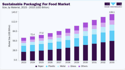 - 米国の食品産業向け持続可能な包装市場は、2025年から2033年にかけて8.1%という大幅なCAGRで成長すると予測される。