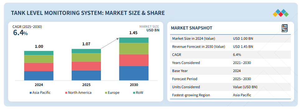 世界のタンクレベル監視システム市場は、2025年の10億7,000万米ドルから2030年までに14億5,000万米ドルへ成長し、年平均成長率(CAGR)6.4%を記録すると予測されています。タンクレベル監視システムは、貯蔵タンク内の液面レベルを測定・追跡するために使用され、産業全体で正確な在庫管理、漏洩検知、プロセス最適化を実現します。