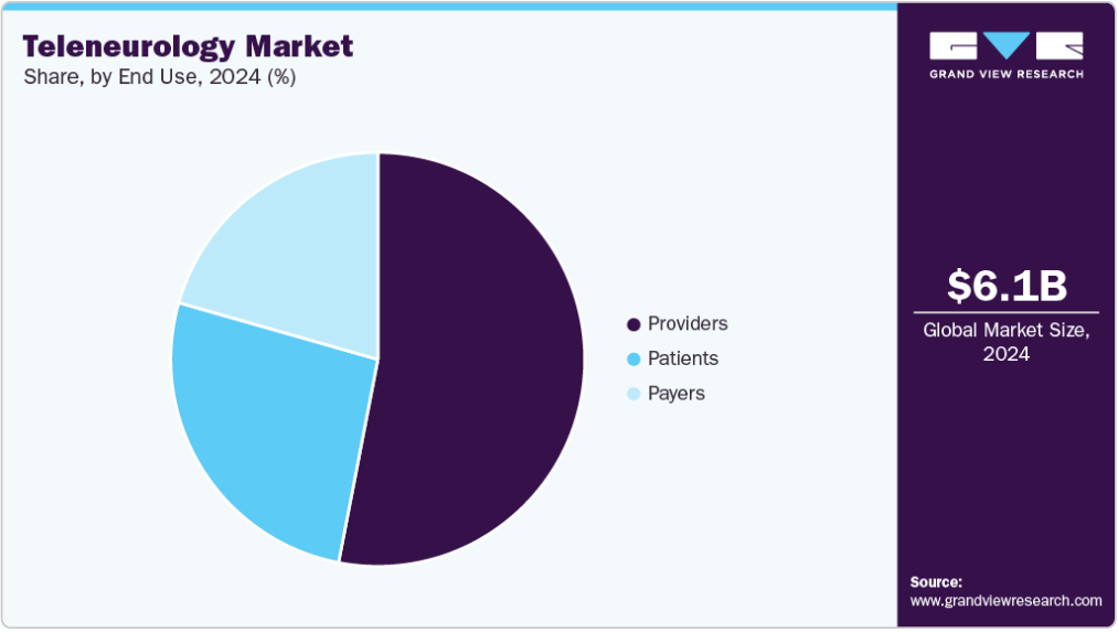 2024年にはプロバイダーセグメントが市場を支配し、収益シェア53.04%を占めた。これは病院、専門クリニック、神経センターが遠隔神経学サービスを統合し、診療範囲の拡大と専門医の最適配置を図る動きが加速しているためである。医療は、特に脳卒中管理やてんかんモニタリングなどの状況において、タイムリーな神経内科ケアを提供するために遠隔診療と遠隔モニタリング技術を活用しています。患者の待ち時間短縮、臨床効率の向上、治療成果の改善に対する圧力の高まりが、仮想神経内科プラットフォームの導入を推進しています。さらに、遠隔医療インフラの進歩と支援的な償還政策により、より多くの提供者が遠隔神経内科機能への投資と拡大を促進されています。