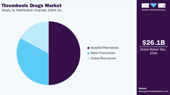 2024年には、病院薬局セグメントが49.98%という最大の市場収益シェアを占めた。本市場は、血栓性疾患の発生率増加、医薬品開発の進歩、専門的な薬剤管理の必要性によって牽引されている。病院薬局は、医薬品の安全かつ効果的な使用を確保することで医療システムにおいて極めて重要な役割を果たしている。専門医薬品の継続的な需要と薬剤管理における先進技術の統合により、このセグメントは今後も大きな市場シェアを維持すると予想される。