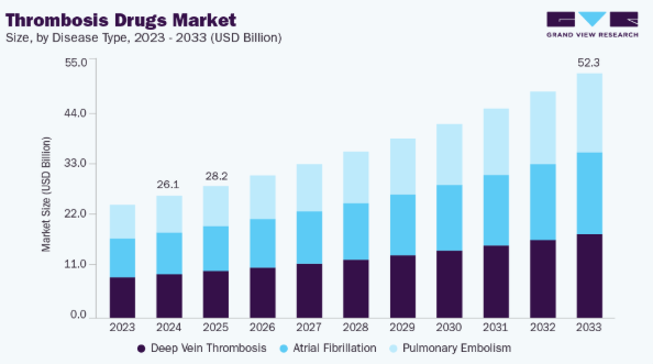 高齢化が進む世界人口は、高齢者が血栓症および関連合併症にかかりやすいため、市場の成長をさらに促進する。より安全で便利な経口薬を含む抗凝固療法の進歩は、患者の転帰を改善し、より広範な採用を促す。さらに、肥満、糖尿病、高血圧などの生活習慣病の有病率の上昇、血栓症リスクへの認識の高まり、医療費の増加が相まって、持続的な市場拡大を支え続けている。