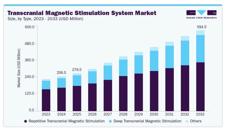 さらに、臨床試験と規制当局の承認拡大、保険適用範囲の拡大が小児医療における普及の基盤を整えており、早期介入戦略への注目度の高まりが需要を牽引しています。例えば2025年3月、ニューロネティクス社は、シグナ・グループの完全子会社であるエバーノース・ヘルス・サービスがNeuroStar経頭蓋磁気刺激療法(TMS)の保険適用範囲を拡大したと発表しました。この拡大により、15歳以上の大うつ病性障害(MDD)を患う思春期患者も対象となりました。約1,500万人の被保険者をカバーするこの新方針は、うつ病治療における薬物療法以外の選択肢を求める思春期患者にとって、非薬物治療へのアクセスを大幅に強化します。これらの要因が相まって、小児分野における市場の急速な拡大が予測され、この期間中のTMS市場全体における主要な成長ドライバーとなる見込みです。