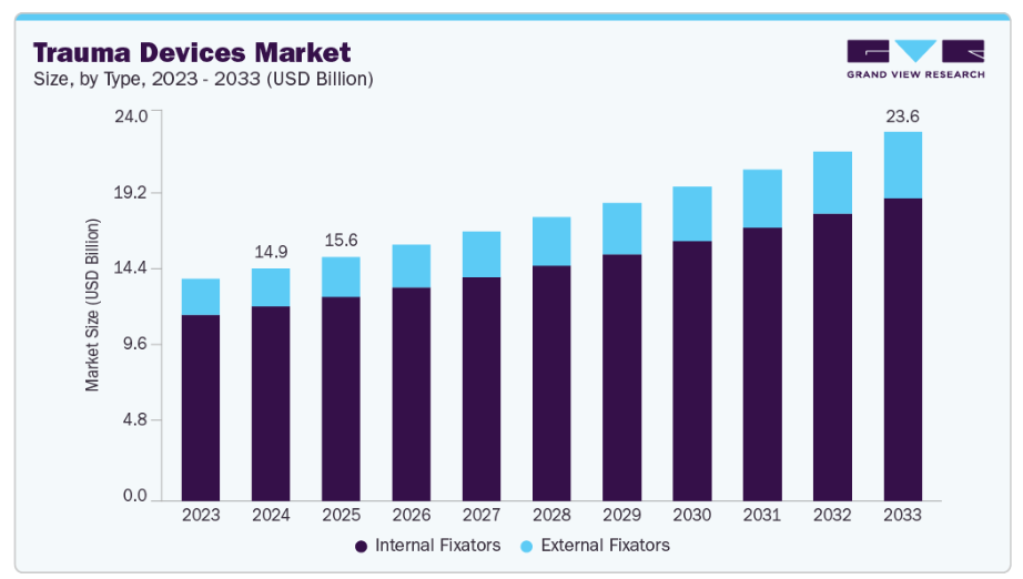 骨粗鬆症やその他の骨変性疾患に関連する脆弱性骨折は、特に高齢化社会において医療システムに大きな負担をかけています。これらの損傷は、可動性の回復と患者転帰の改善のために、プレート、スクリュー、ロッド、外固定器などの外傷用器具を用いた外科的安定化を必要とする場合が多くあります。骨粗鬆症をはじめとする骨脆弱化疾患の増加が続く中、予測期間において先進的な治療法への需要は拡大すると見込まれます。