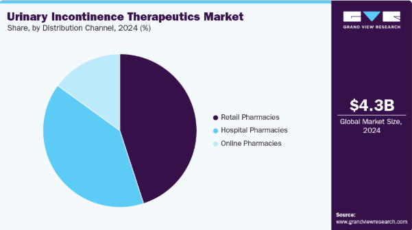 切迫性尿失禁セグメントは、過活動膀胱が主要な臨床的懸念として認識されるようになったことから、予測期間中に5.8%という最も高いCAGRで成長すると予測されている。2023年8月のNIH報告書によると、切迫性尿失禁は40~44歳の女性の9%、75歳以上の女性の31%、75歳以上の男性の42%に影響を与えている。カフェインやアルコール摂取などの生活習慣因子は症状を悪化させ、治療介入の必要性をさらに高める。β3アドレナリン受容体作動薬の受容拡大により、尿意切迫関連症状を呈する患者の治療成果が向上している。薬物送達システムの継続的革新により、有効性と緩和持続時間が向上している。意識向上、正確な診断、先進的治療法が全年齢層での需要を牽引している。小売薬局やオンライン薬局を通じた治療アクセスの拡大が、普及加速と持続的な市場成長を支えている。