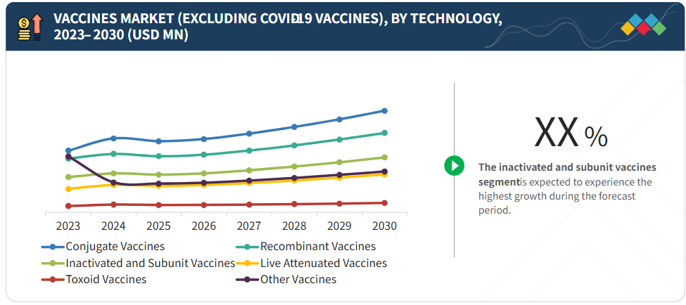 様々なワクチン技術(COVID-19ワクチンを除く)には、結合型ワクチン、不活化・サブユニットワクチン、弱毒生ワクチン、組換えワクチン、トキソイドワクチンなどが含まれます。結合型ワクチン市場の大きな割合は、政府支援の拡大と、これらのワクチン開発を目的とした官民連携の増加に起因しています。