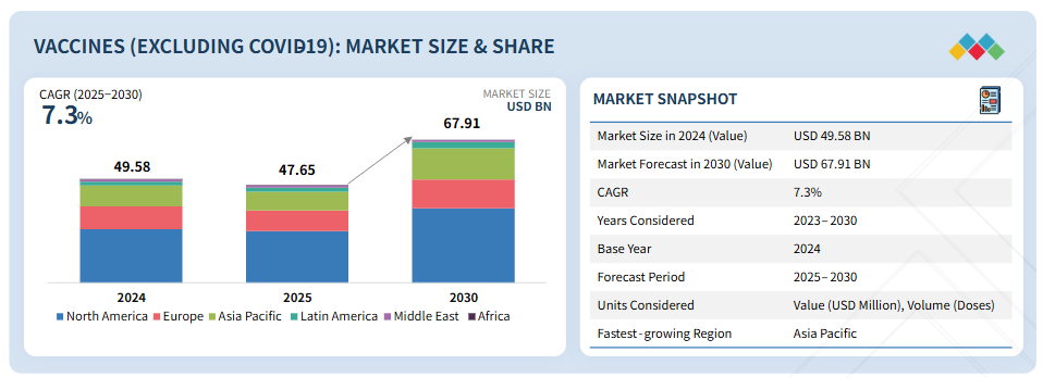 世界のワクチン市場は、予測期間において年平均成長率(CAGR)7.3%で成長し、2025年の4765万米ドルから2030年には6791万米ドルに達すると見込まれております。