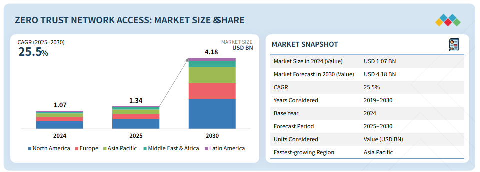 ゼロトラストネットワークアクセス(ZTNA)市場は、サイバー脅威の増加、クラウド導入の拡大、および安全なIDベースのアクセスモデルへの世界的な移行を背景に、今後10年間で急速な成長が見込まれています。ZTNA市場は、2025年の13億4,000万米ドルから2030年までに41億8,000万米ドルに達すると予測されており、2025年から2030年までの年間平均成長率(CAGR)は25.5%と見込まれています。組織は、アプリケーションやデータへの安全でシームレスかつ適応性の高いアクセスを提供する能力からZTNAを採用しており、現代のデジタル環境において不可欠な存在となっています。リモートワークの拡大、規制順守、攻撃対象領域の最小化への関心の高まりが、重要なサイバーセキュリティソリューションとしての役割をさらに強化し、企業における広範な導入の基盤を築いております。