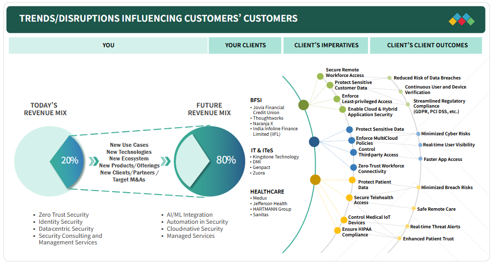 図は、業界を横断した収益構造の変化と顧客優先事項の進化を浮き彫りにしております。現在、収益の80%は既存サービスから、20%は新規事業から得られております。今後4~5年でこの割合は逆転し、新興技術、AI/ML統合、マネージドサービスが重視される見込みです。BFSI(銀行・金融・保険)、IT・ITES(情報技術・IT関連サービス)、医療などの主要セクターでは、データ保護、セキュアなアクセス、規制コンプライアンスが優先課題です。これらの要請は、侵害の減少、ユーザー可視性の向上、アプリケーションアクセスの高速化、患者信頼の強化、リスク最小化といった顧客成果につながります。